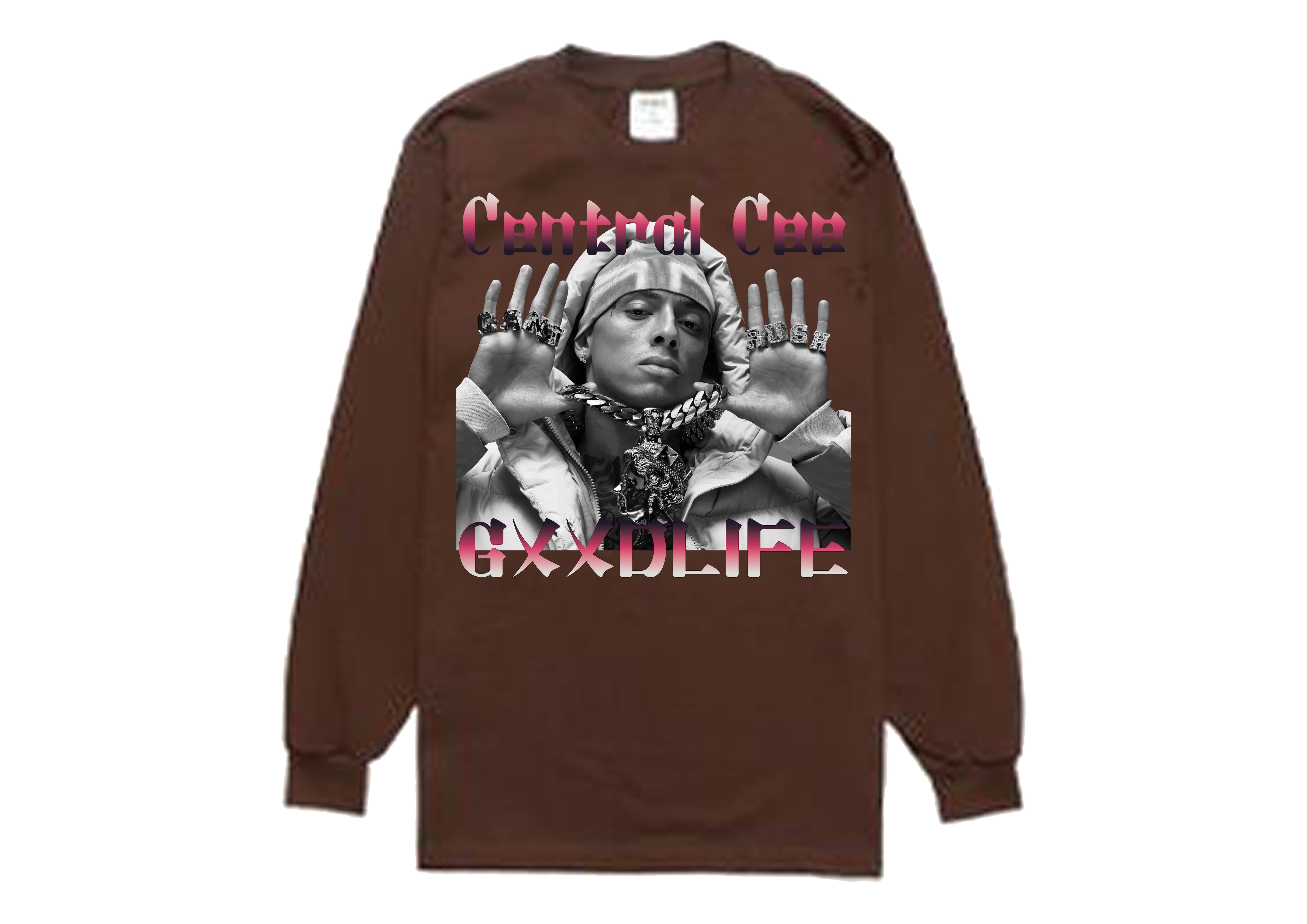 ブラックボディに映えるピンクグラデーションの「Central Cee」「GXXDLIFE」の文字が、ストリート感をさらに引き立て、都会的で洗練された印象を演出。