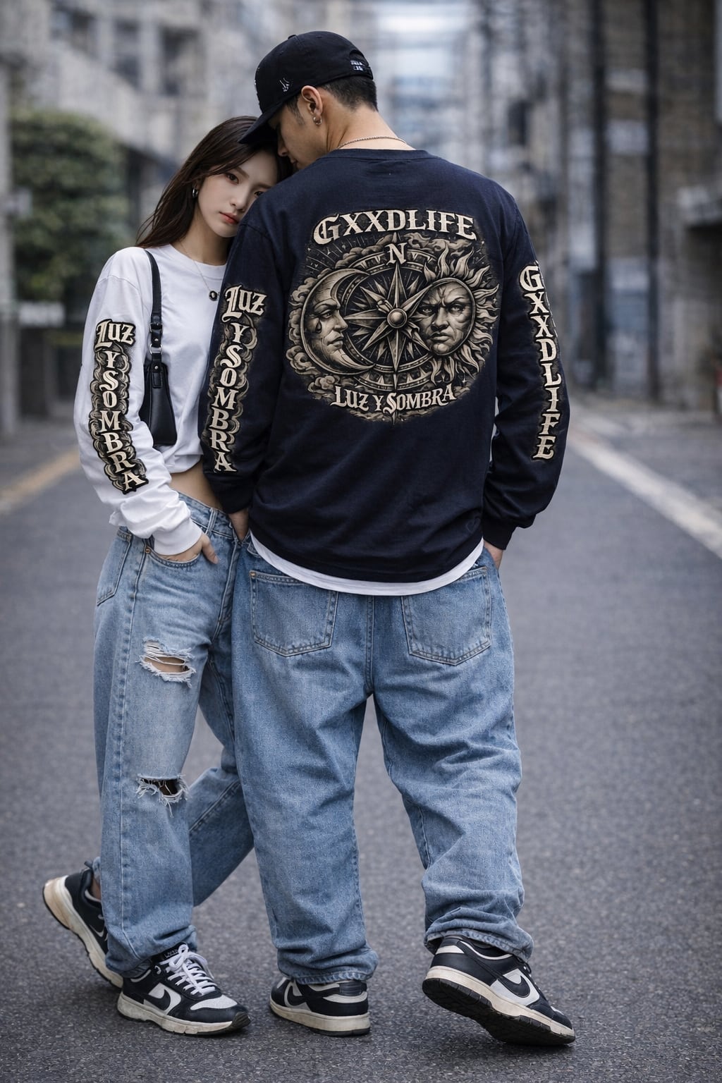 GXXDLIFE “LUZ Y SOMBRA” ロングスリーブTシャツ光と影——相反する二面性をテーマにした、GXXDLIFEの象徴的ロングスリーブ。背面には「LUZ Y SOMBRA(光と影)」のメッセージを落とし込んだ重厚なグラフィックを大胆に配置。コンパスと二つの顔が、善と悪・昼と夜・信仰と葛藤といった相反する世界観を表現しています。